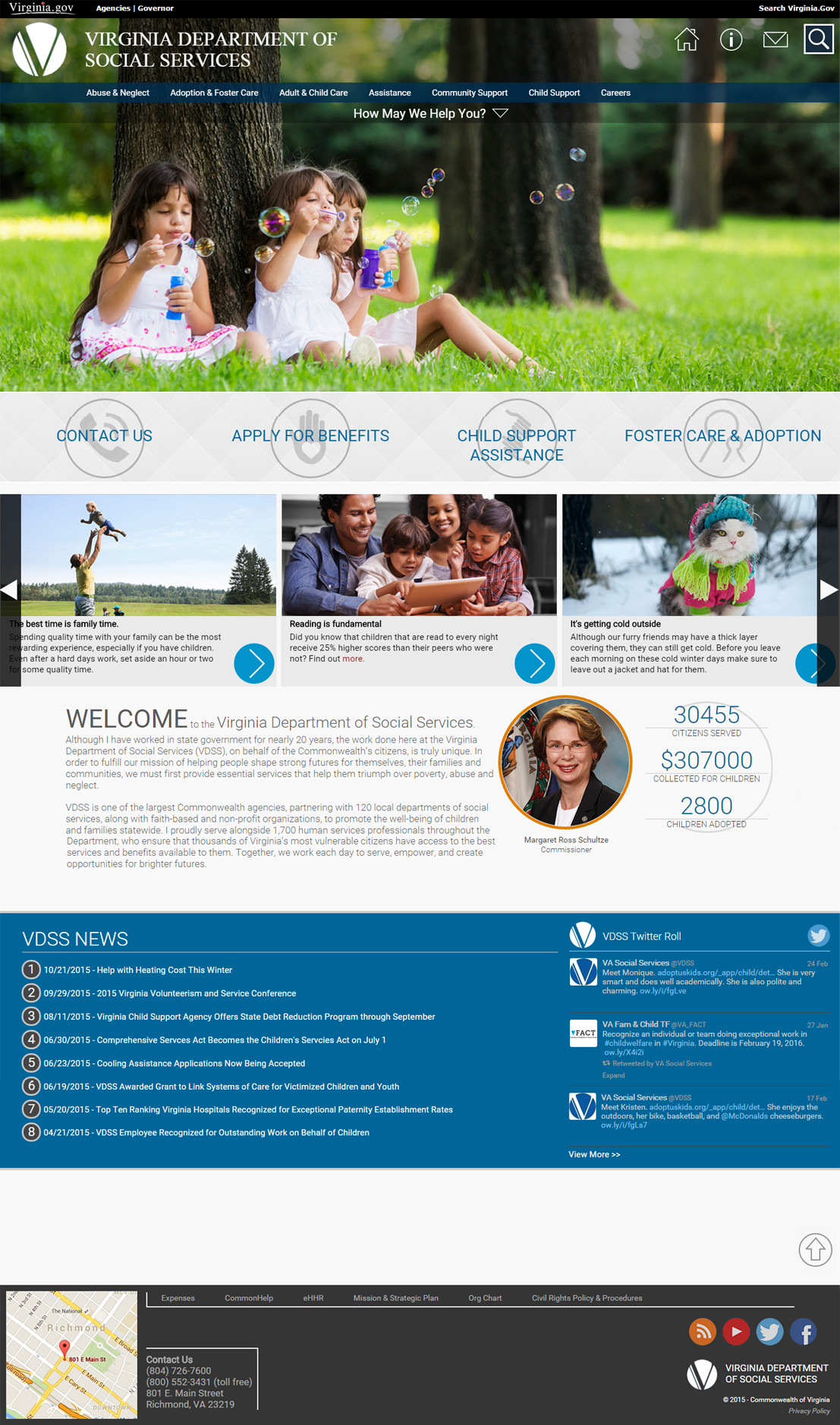 The Virginia Department of Social Services mission statement is "People helping people triumph over poverty, neglect and abuse." A powerful statement which deserves a powerful presence on the web. As I mention on the intranet page, when I joined the organization their web developer had abandoned them, leaving a major hole in the public affair's division. I was initial brought on to assist him in design and development efforts; however, due to his departure I was now lead. I felt the same pressure with this site as the intranet site as I put forth my best efforts to address the backlog of updates requested by the agency.